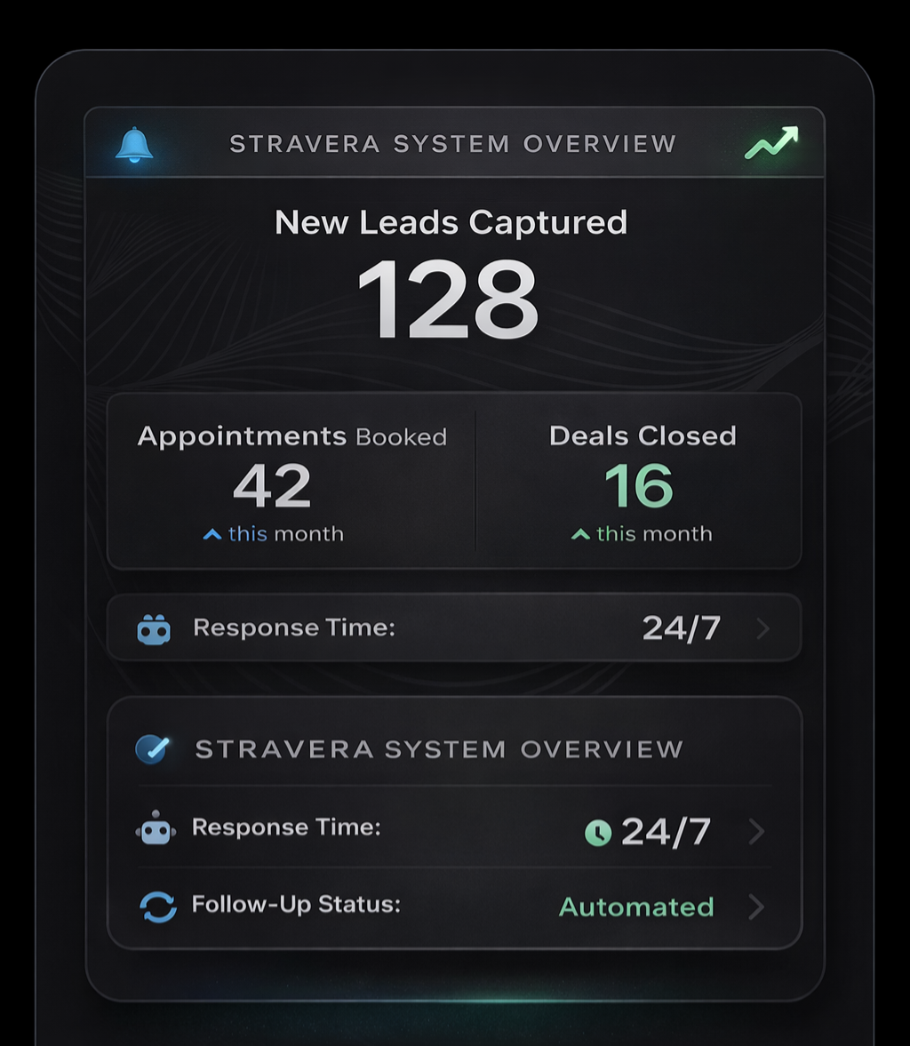 Stravera captures leads, responds instantly, books appointments, manages reputation, and tracks performance — all in one automated system.
